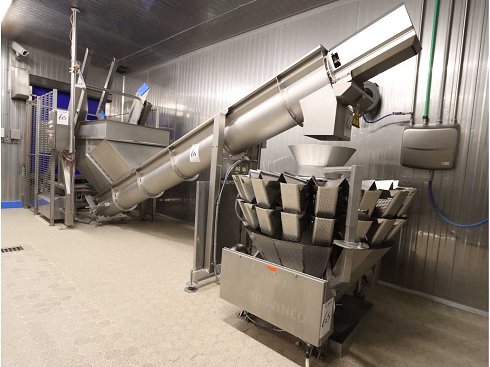 Consta de: basculador con cadena de alimentación, ancho de vía 850 mm, longitud 2000 mm, incluyendo elevador transportador con tolva receptora, tornillo Ø 400 mm, longitud de tornillo 4500 mm, altura de salida 1500 mm, depósito de apertura de alimentación aproximadamente 1100x1300 mm, pesador multicabezal "Bilwinco", tipo BW118W 18 cabezas, rango de pesaje 10-3000 gramos, incluyendo estante móvil con accesorios, pasaje de suelo no incluido |