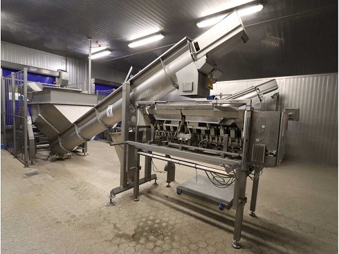 Consta de: basculador con cadena de alimentación transportadora, ancho de vía 850 mm, longitud 2000 mm, incluyendo elevador transportador con tolva receptora, tornillo Ø 400 mm, longitud de tornillo 4500 mm, altura de salida 1500 mm, depósito de apertura de entrada aprox. 1100x1300 mm, pesador "Newtec" tipo 2012, 12 líneas, rango máximo de pesaje 2000 gramos, pasaje de suelo no incluido |