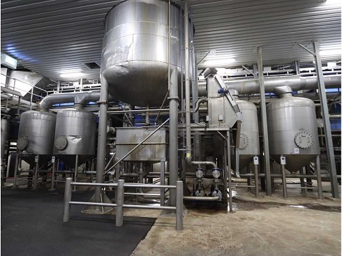 Consta de: 3 unidades de admisión de acero inoxidable con cintas transportadoras que pasan por debajo, 10 tolvas receptoras en estructura de acero con cinta transportadora de paso superior, sistema de tanque vertical de acero inoxidable de 5 pliegues, de varios tamaños con diferentes bombas, 1 tanque de almacenamiento de pulpa de acero inoxidable, criba vibrante en plataforma con búnker subconstruido, varias bombas, tuberías |