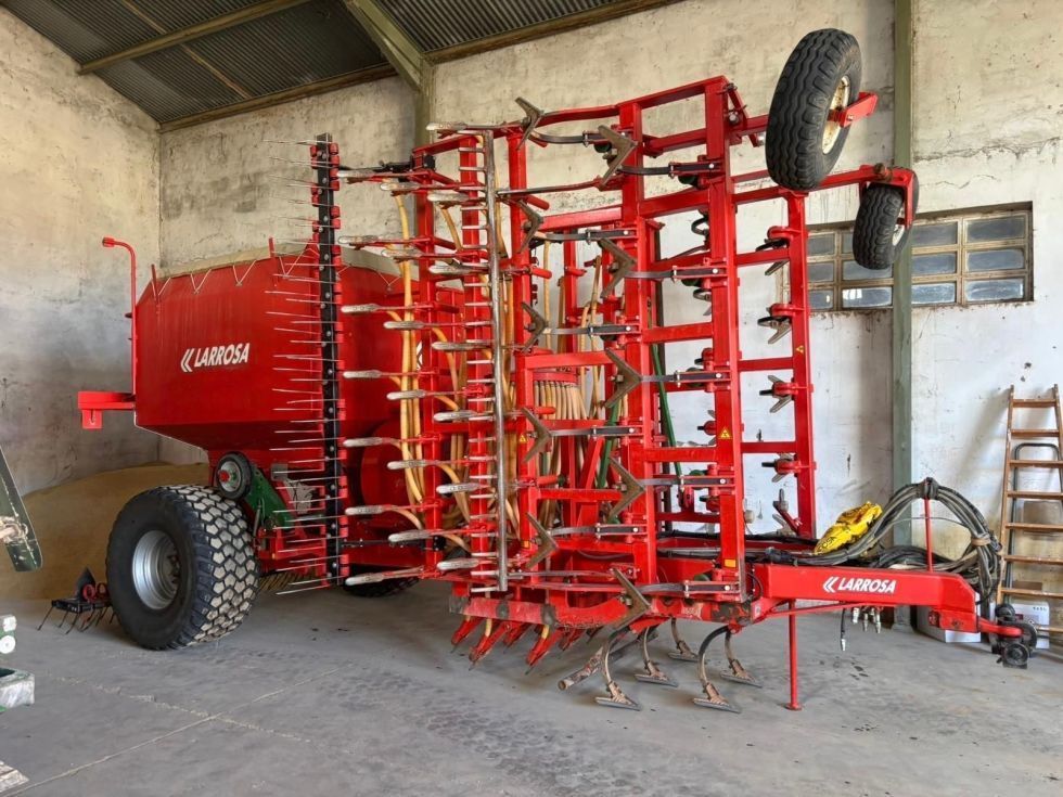 Sembradora neumática usada marca Larrosa, de siembra tradicional, de 7 metros de ancho de trabajo, plegable a 3 metros para transporte.
