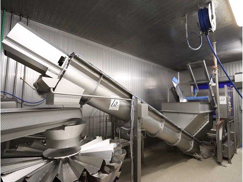 Equipado con cinta transportadora de cadena de entrada, ancho de vía de 850 mm, longitud 2000 mm, incluyendo transportador de tornillo del ascensor con tolva receptora, tornillo Ø 400 mm, longitud del tornillo 4500 mm, altura de salida 1700 mm, bunker de apertura de entrada aprox. 1100x1300 mm, sin plataforma ni escaleras |