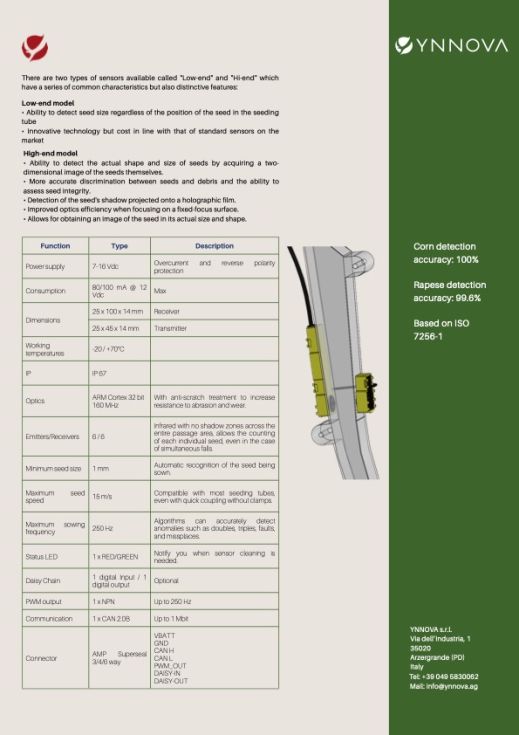 | Detalles | En la agricultura 4.0, la siembra de precisión es esencial para mejorar la eficiencia, el rendimiento y el ahorro de recursos. El control preciso de la colocación de las semillas reduce el desperdicio, optimiza los insumos y maximiza la productividad, especialmente en cultivos como el maíz, la canola y las hortalizas. Para lograr estos resultados, se necesitan sensores capaces de monitorear el flujo de semillas en el tubo de caída en tiempo real. El innovador sensor de siembra ROBIN de Ynnova utiliza fotocélulas infrarrojas y un diseño óptico avanzado para detectar semillas de tan solo 1 mm, distinguiendo su forma y posición y rechazando las impurezas. Los algoritmos de IA garantizan un conteo extremadamente preciso, detección de semillas dobles y omitidas, y un caudal instantáneo. La compensación de suciedad garantiza la continuidad operativa, mientras que la comunicación CAN bus proporciona datos y diagnósticos en tiempo real. El resultado es una siembra más uniforme, controlada y altamente fiable. Mínima sensibilidad a la suciedad, lo que reduce los intervalos de limpieza. Existen dos tipos de sensores disponibles: de gama baja y de gama alta, que Sensor de semillas de alto rendimiento para sembradoras de precisión, apto para montaje en soporte de disco. Se basa en tecnología de fotocélula infrarroja combinada con un diseño óptico avanzado que mejora la precisión en el reconocimiento y conteo de semillas. |