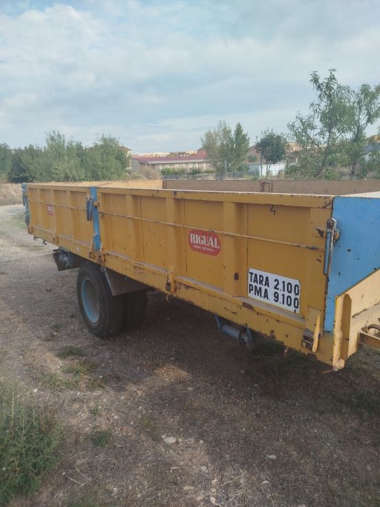 | Detalls | Remolquie agricola marca RIGUAL de ocasion. Equipado con eje con doble rueda. Volquete hidraulico . El remolque siempre ha dormido en garaje . Medidas segun documentacion Longitud 5520 anchura 2170 altura con las barandillas 1850 mm. Masa maxima autorizada 9150 kg tara 2.150 kg. El remolque esta documentado por la DGT con matricula. LA venta se realiza de particular a particular. |