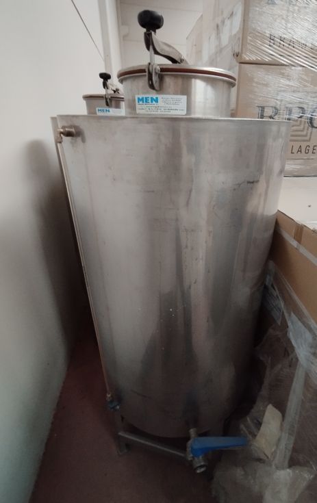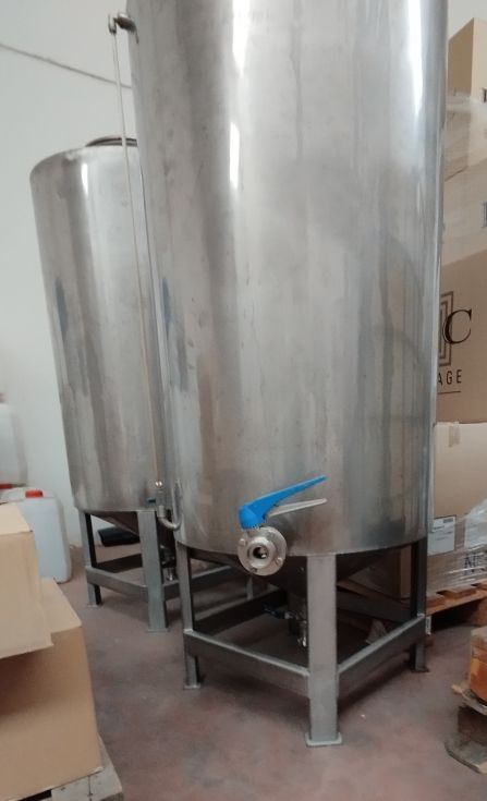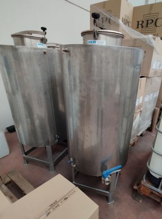 | Detalls | Lote de 7 depósitos fabricados en inoxidable. Volumen de 200 litros cada uno. Con boca de hombre superior, nivel exterior, salida inferior centrada, válvula de salida inferior lateral. Montado sobre estructura de 4 patas. En perfecto estado. Precio a convenir. |