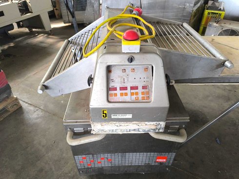 Laminadora de masa reversible industrial con brazos plegables, cinta transportadora, panel de control programable, botones de parada de emergencia y construcción de acero inoxidable. |