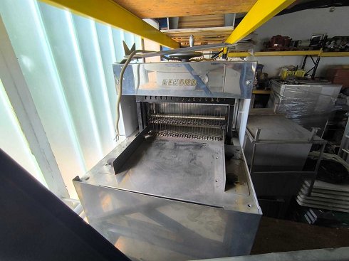 Cortadora de pan comercial con múltiples cuchillas recíprocas y alimentación de transportador integrada. Adecuado para el corte de panes uniformes de panadería de alto rendimiento. |