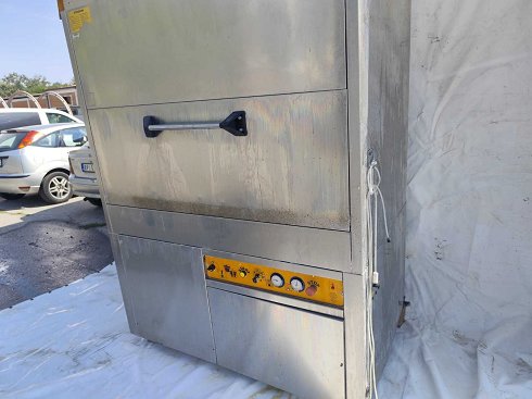 Potencia: Probablemente Gas + Electricidad Lavadora industrial de bandejas/utensilios con carcasa de acero inoxidable y puerta abatible. Estante interno para cestas o contenedores, manómetros / temperatura, controles de calentadores de gas y temporizador de ciclo. |