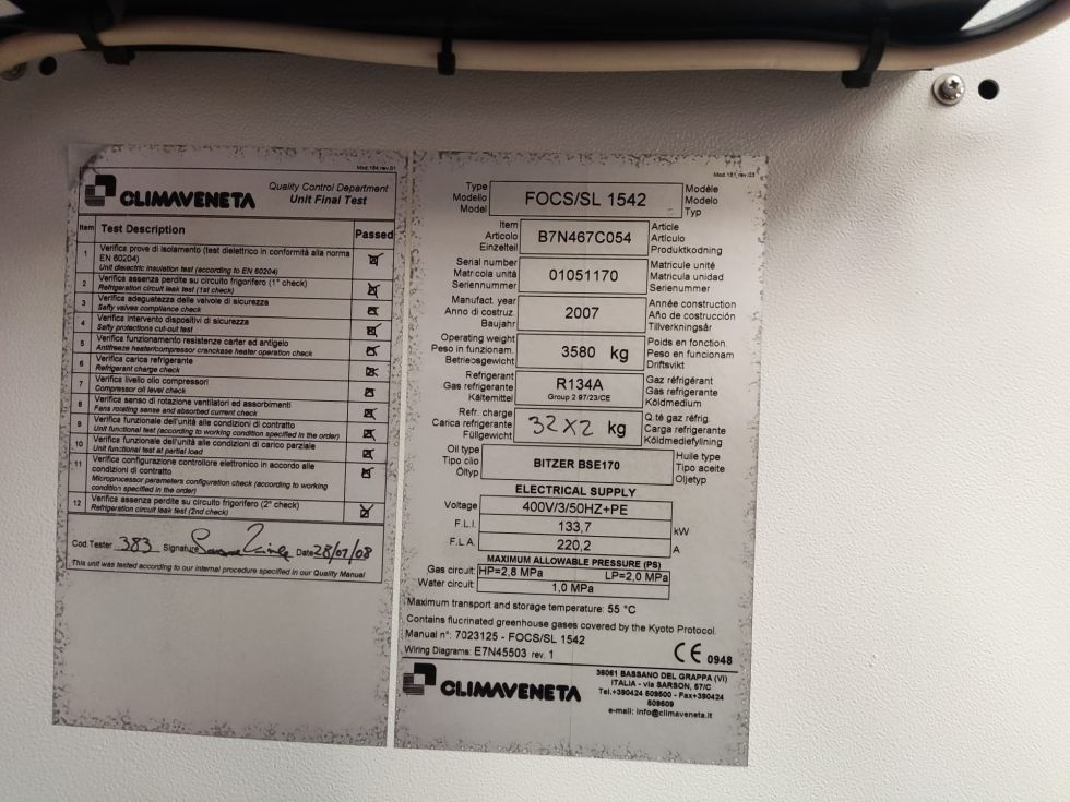 Climaveneta enfriadora de 252 Kw (216720 Frigorias) Solo frio, 380III, R134A consumo 133 Kw . Marca Climaveneta Modelo:FOCS/SL 1542, Medidas, Ancho: 2222 mm X Fondo 4610 mm x Alto 2150 mm. Peso:3580 kg, En perfecto estado. Damos garantía. Iva no incluido. Enviamos a toda España. Referencia:1055 Ideal para hoteles, restaurantes, centros comerciales, oficinas, procesos industriales como metal plastico moldes, mataderos, procesos alimentarios y camaras de frio. |