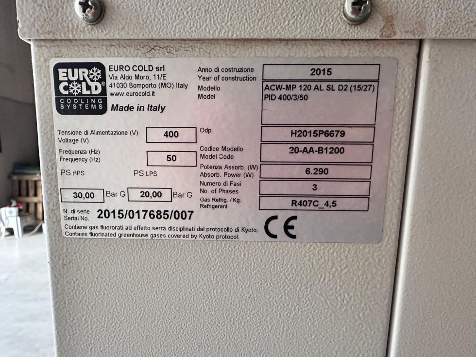 | Detalles | Enfriadora de agua, marca Eurocold de 15 kw (13.072 frigorias), modelo ACW-MP120 AL SL D2, con deposito de 65 litros, Gas R-407C, consumo : 6,4 kw, caudal de agua de 20 a 100 litros/minuto, Medidas : 755x790x1380 mm alto, peso 190 kilos. utilidades: procesos de plasticos, aire acondicionado, automocion, quimica farmaceutica, alimentacion,laser, maquina herramienta,enologico etc. |