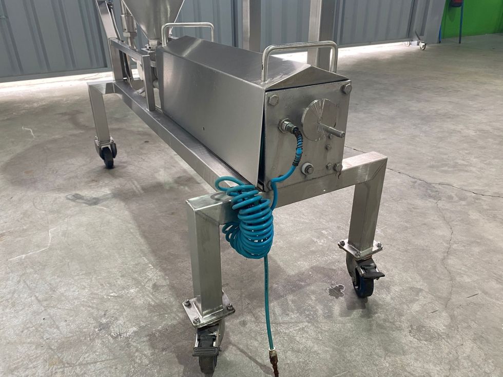 Llenadora volumétrica de piston fabricada en acero inoxidable con ruedas y tolva de recepción de producto.