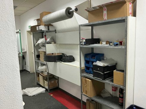 Compuesto por: 2 estantes de 900 mm de ancho, soporte para área de trabajo de 1400 mm; dispositivo de flejado, dispensador de cinta, estante sin contenido visible. |