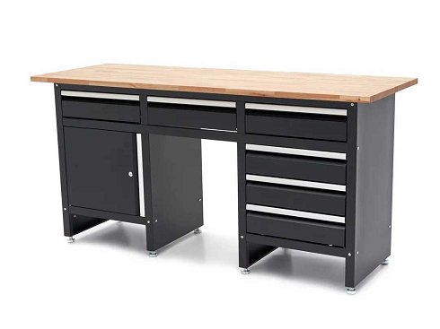 Banco de trabajo con 6 cajones y encimera de madera maciza Dimensiones del compartimento de la puerta (ancho x fondo x alto) 940 x 400 x 440 mm Dimensiones del cajón pequeño (ancho x fondo x alto) 460 x 400 x 120 mm Ajuste de altura máx. 40 mm Longitud 1700 mm Ancho 600 mm Altura sobre el suelo 860 mm Carga de mesa 400 kg Dimensiones L x W x H 1700 x 600 x 400 m Peso 70 kg |