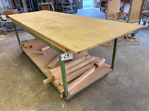 Mesas de trabajo aprox. 2500/2800 x 1050 mm y altura de trabajo aprox. 940 mm (El artículo está en condiciones existentes y sin verificar. ¡Los costos de desmontaje y carga son vinculantes! ¡El artículo se vende sin máquinas/herramientas/contenido/material!) |