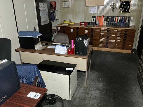 Oficina del taller compuesta por: dos escritorios, cinco sillas giratorias, un armario con cajones de madera para herramientas, una cómoda, siete cajones metálicos, dos armarios metálicos, una cómoda con cuatro cajones metálicos, ordenador y más en la foto