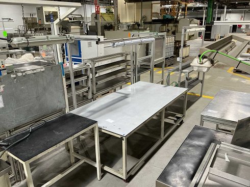 Estructura metálica móvil con sobre metálico amplio, bastidor superior con luminaria y puntos de conexión eléctricos. Ideal para montaje o workstation en línea de producción. Montada sobre ruedas para facilitar el desplazamiento.