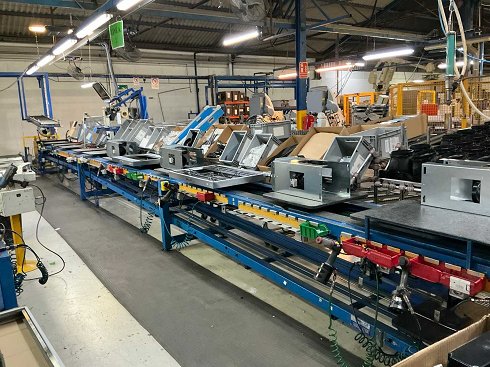 Línea de montaje manual que incluye áreas de almacenamiento con componentes de ensamblaje, varios bancos de trabajo para montaje manual y un sistema hidráulico para el suministro de herramientas de alimentación.