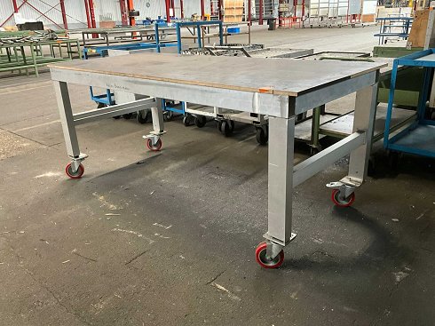 móvil; equipado con 4 ruedas giratorias; cuadro de aluminio; superficie de mesa de contrachapado;