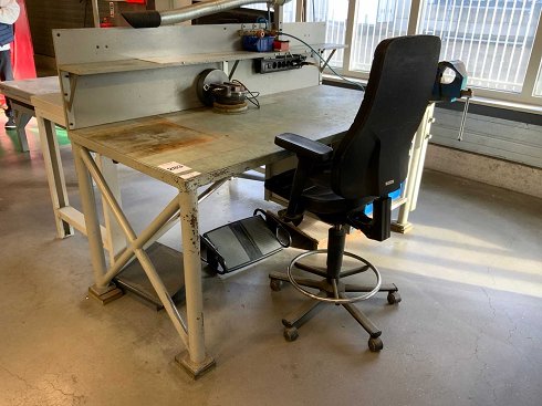 Banco de trabajo metálico con barra de luz, silla de oficina y reposapiés, incluyendo cajonera con contenido, incluyendo abrazadera de herramientas y tornillo de banco Equipado con aire comprimido que el cobre debe desconectar antes de arrancar en el tubo montado en la pared. (La parte restante debe permanecer en el edificio) Así como un sistema de aire de extracción, que el cobre debe desconectar justo antes de empezar la tubería montada en la pared |