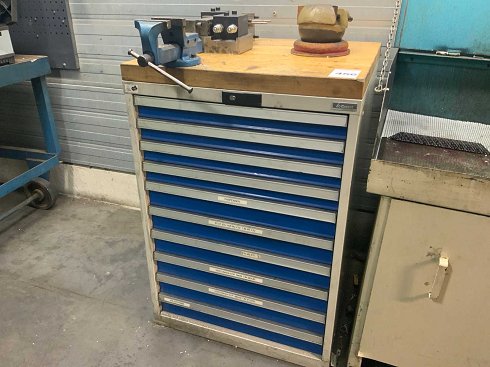 Equipado con banco de banco, abrazaderas y 10 cajones con contenido. El contenido consistía, entre otras cosas: tornillos avellanados, pasadores de varilla, pasadores de transición y papel de lija. |
