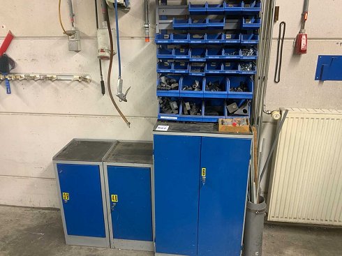 Equipado con una pared trasera con bandejas con tuercas y tornillos. Se incluye el contenido de los armarios, compuesto por varias fresadoras. Además, se incluye un soporte de pared separado en la pared. Dimensiones: armario grande: 60 x 44 x 101 cm (183 cm de alto con pared trasera). Dimensiones: armarios pequeños: 35 x 35 x 75 cm. La clave de 1 caja no está presente |