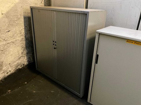 Equipado con 2 puertas enrollables verticales, 2 estanterías y 1 llave.