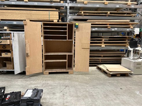 Móvil, se puede conducir por debajo con un transpaleto, cerradura sólida, a prueba de robos. Se utilizaba para el montaje de ferias comerciales, con compartimentos firmemente laminados. |