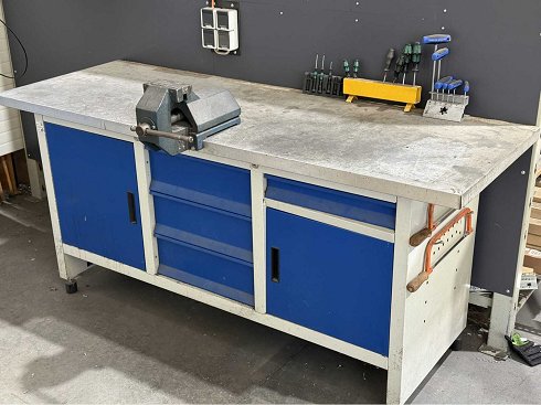 Ancho del banco de trabajo aprox. 2000 mm; equipado con prensa; Contenido: diversas herramientas manuales; Ver fotos para más detalles