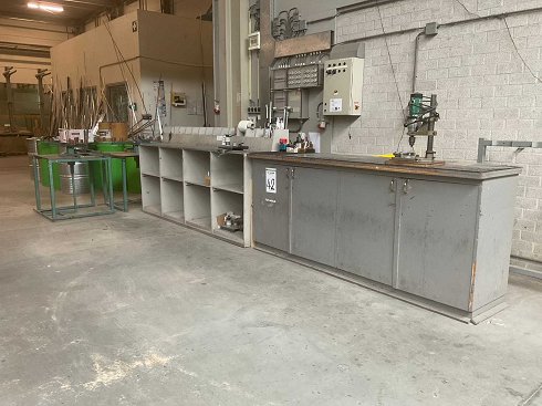Lote compuesto por: (2x) mesa de rodillo/soporte con brazos giratorios y rodillos de goma, dimensiones: L800xB800xH1060mm. (1x) armario de almacenamiento / banco de trabajo con división de compartimentos, Dimensiones: L2470xB600xH1220mm. (1x) banco de trabajo de madera con espacio en armarios, dimensiones: L2330xB590xH990mm Incluye contenido con: (1x) taladro con trípode, tornillo de banco, varios accesorios y herramientas. |