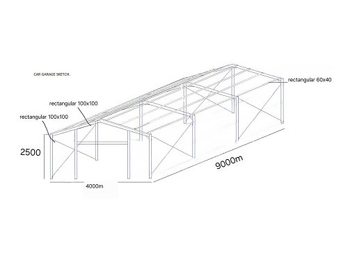 La construcción consta de: 4 cerchas hechas de tubería cuadrada de 100x100; 8 pilares hechos de tubo cuadrado 100x100; 2 pilares de soporte hechos de tubo cuadrado de 100x100; barra transversal de puerta hecha de perfil U 100; cuñas de unión hechas de tubo rectangular 60x40; refuerzos para pilares hechos de tubería rectangular 30x20;
