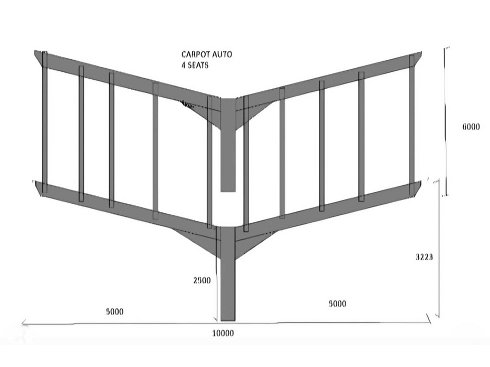 LOTE 7 Tipo: Coches de coches 4 plazas Material: Construcción en acero Año de construcción: 2026 Superficie total: 60 m ² Tamaño total (1): L 6000 mm Tamaño total (2): L 10000 mm Altura: 2500 mm Altura de la cumbrera: 3223 mm Información adicional: Pendiente del tejado: 10 grados; Pintó zinc de Galva; La construcción consta de 4 vigas (cerchas de perfil) de perfil IPE 180 y 2 columnas de perfil HEA 220; Toda la estructura está ensamblada con pernos (extraíbles); Estado: no utilizado; La estructura incluye un certificado de conformidad para los materiales;