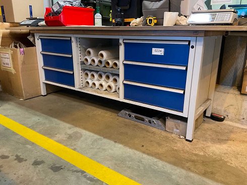Con 2 cajones de 3 cajones, un lado con llave y otro lado abierto, pero con la cerradura de la llave rota. Equipado con encimera adicional, dimensiones aprox. 280x109x3 cm. |