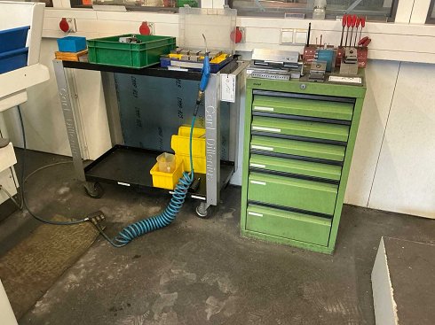 Tranvía de transporte de estantería: aprox. 1000x460x900mm - sin soporte / contenido Armario de cajones: 7 compartimentos; aprox. 500x500x900mm - sin soporte / contenido