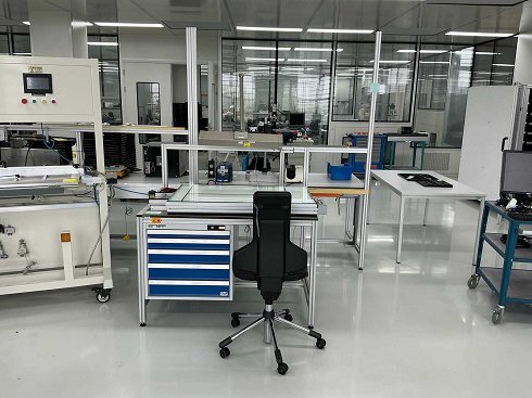 La estación de trabajo consta de 1 mesa gris claro, 1 armario de cajones Garant y 1 placa de luz. |