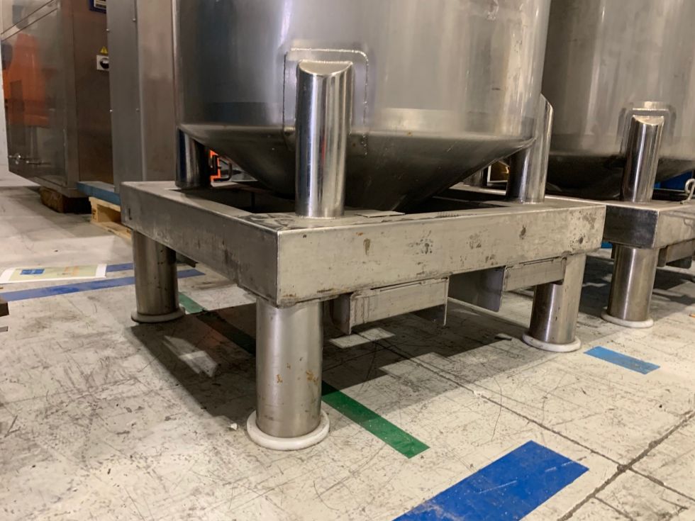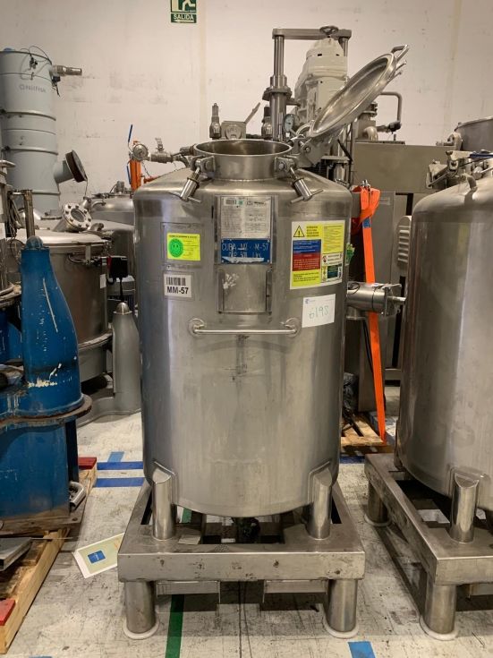| Details | Depósito vertical fabricado en acero inoxidable con una capacidad útil de 500 litros. Fondo superior klopper con boca de hombre de apertura manual con cierres manuales, colector con entronques roscados y conexión de carga tipo camlock Con 4 patas montado sobre estructura de acero inoxidable con railes para mobilididad mediante toro o transpaleta. Características generales: Fabricante: INOXGUER Material: Acero inoxidable Año de fabricación: 1999 Presión de diseño 0.9 kg/cm2 Presión de prueba 1.35 kg/cm2 Características técnicas: Volumen: 500 l (útiles) Tipo de fondo: Sup. klopper - Inf. cónico Sobre: Estructura 800X860 mm Diámetro exterior cuerpo: 810 mm Altura cuerpo: 1050 mm |