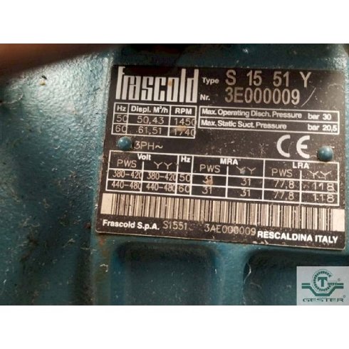 | Detalles | Equipo de frío para agua (Chiller) - Marca: Aeroclima Egara - Compresor marca: Frascold, modelo: S1551, - Potencia: 3CV ( 2,21 kW) |