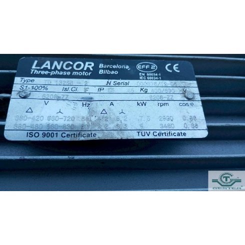 DetallesMotor de patas: 7,5 kw, marca: Lancor, modelo: MA132S2-2 a 3000 rpm.