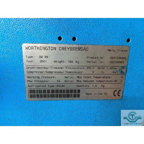 | Detalles | Secador de aire para compresor. Marca: Worthington Creyssensal, modelo: DW46. Para compresor: 40 cv, año: 2001. |