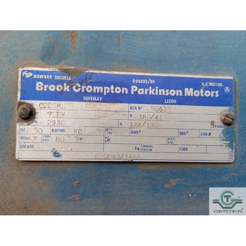 | Detalles | Motor Motor de patas y brida, Marca: BROOK CROMPTON PARKINSON, 75 KW (100 CV), 2930 rpm, 380 V, 144 A. Corriente alterna. |