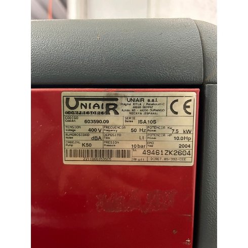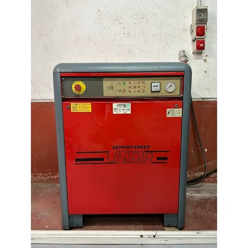 | Detalles | Compresor de aire industrial de tornillo - Marca: Uniair - Año: 2004 - Horas de trabajo: 17.500 - Potencia: 10 CV (7,5 kW) - Inlcuye calderín de 500 litros |