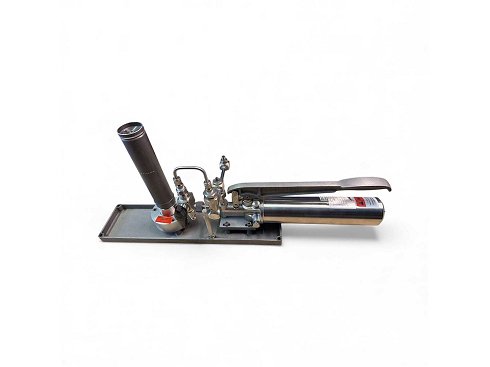 Presión de salida máxima: 15.000 PSI incluyendo el conjunto de pesos y los sellos de repuesto Tipo: Bomba manual hidráulica / Bomba comparadora Rango de presión: 0 a 1.000 bar (15.000 psi) Medio: agua o aceite Depósito: aprox. 1,23 litros