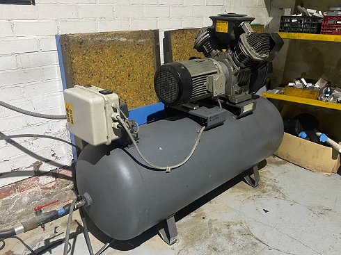 Número de serie: Desconocido. Potencia: aprox. 3–5 kW. Condición: Usado. Notas adicionales: Depósito de aire horizontal con cabezal compresor de doble cilindro. Unidad accionada por correa. Motor eléctrico con cubierta protectora. Placa del depósito certificada por SIAP visible. Ideal para herramientas neumáticas de taller y suministro general de aire comprimido. |