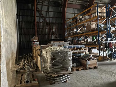 Diversas piezas de máquina pertenecientes al lote nº 5, que consisten, entre otras, en: piezas de acero inoxidable, diversos componentes eléctricos, válvulas de presión, abrazaderas, cables, accionamientos de corriente alterna, caudalímetro, tuberías de aluminio, varios tubos y 2 racks móviles de almacenamiento. |