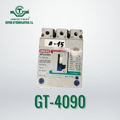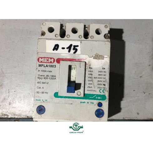 DetallesInterruptor automático general Marca: MEM, modelo: MFLA 1003, potencia: 100 Amp., 3 Polos.