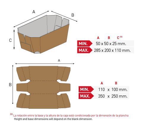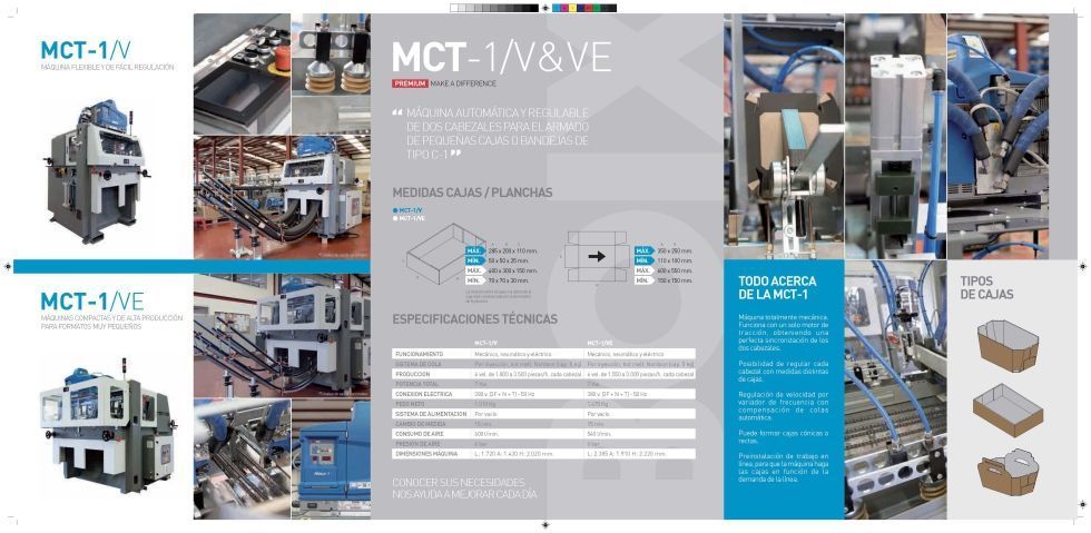 | Detalles | La MCT-1/V es una máquina automática y regulable de dos cabezales para el armado de pequeñas cajas o bandejas de Tipo C-1. (también conocidas como barquetas ó punnets). - Puede formar cajas cónicas y/o rectas.