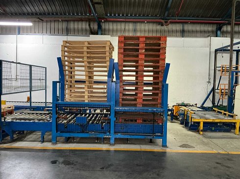 Sistema con dispensador de palets compuesto por un dispensador de paletas de doble fila (dimensiones 2.700 × 1.600 × 2.100 mm), un transportador motorizado de rodillos (dimensiones 3.500 × 1.400 × 600 mm) y un transportador motorizado de rodillos sobre raíles (dimensiones 1.500 × 1.400 × 600 mm).