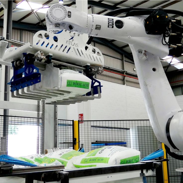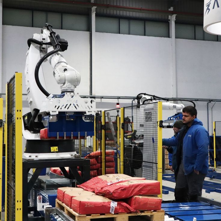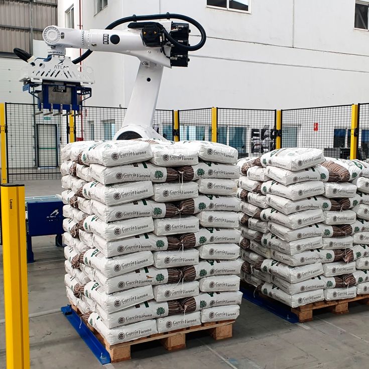 Desarrollamos Sistemas de Paletizado Automátizado con Robots o Células para el Paletizado de SACOS. Ideales para entornos de producción con altas cadencias o cuando las condiciones de trabajo requieren que el trabajo no sea realizado por el hombre.
