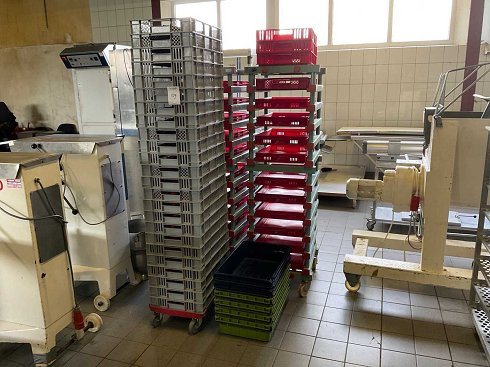 24 contenedores de 60x40x7 cm incluyendo 2 carritos de estantería, 24 contenedores de 60x40x8 cm incluyendo moldes de chocolate para perros, 6 cestas de pan.