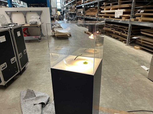 Lacado azul con cubierta de metacrilato en la parte superior del tocadiscos y iluminación para la presentación Sin palet y columna de presentación Back Deke azul con parte giratoria, y iluminación |