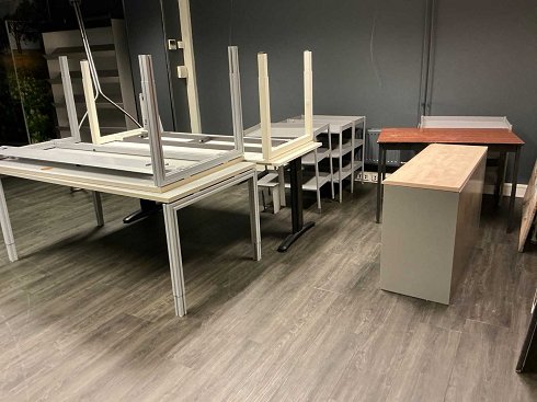 Consta de: escritorios, sillas de oficina de caramelos, sillas, armarios, estanterías de archivo, cocina y mortero decorativo no incluidos