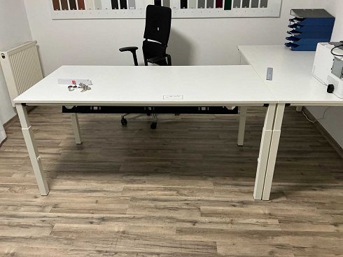 Lo mejor. 2 escritorios de 1.600x800 mm ajustables mecánicamente en altura, 1 mesa de conferencias redonda de 1.000 mm, 1 silla de oficina de tela de acero negro, 1 pared de cartulina de color con tarjetas de color RAL de 2.680x1.360 mm |